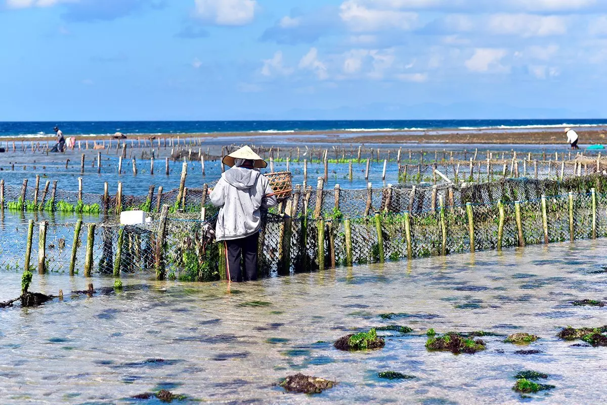 Många av öns invånare lever på att odla havstång. När tidvattnet drar sig tillbaka dyker tångmarkerna upp och du kan se bönderna vada ut i det ankelhöga vattnet för att plocka dagens skörd. Tången läggs i stora flätade korgar, som sedan bärs upp på land där tången får torka i solen.