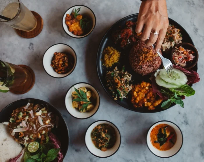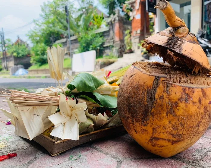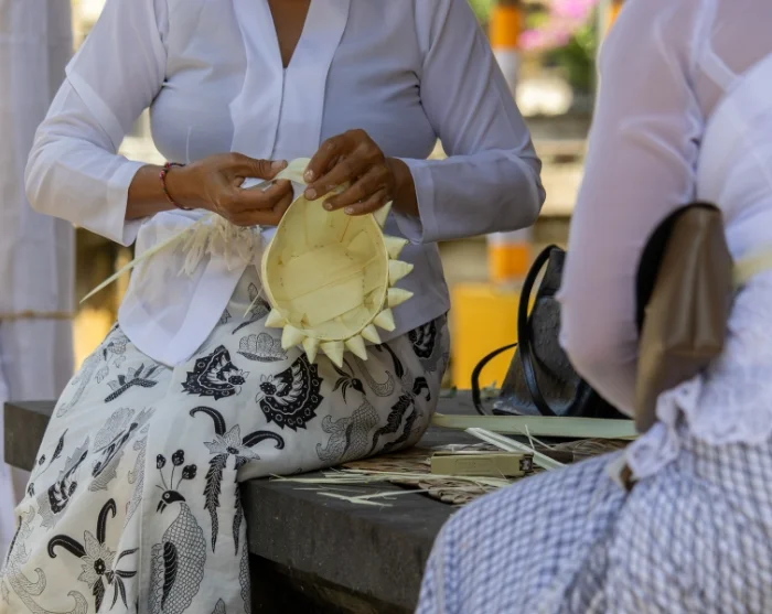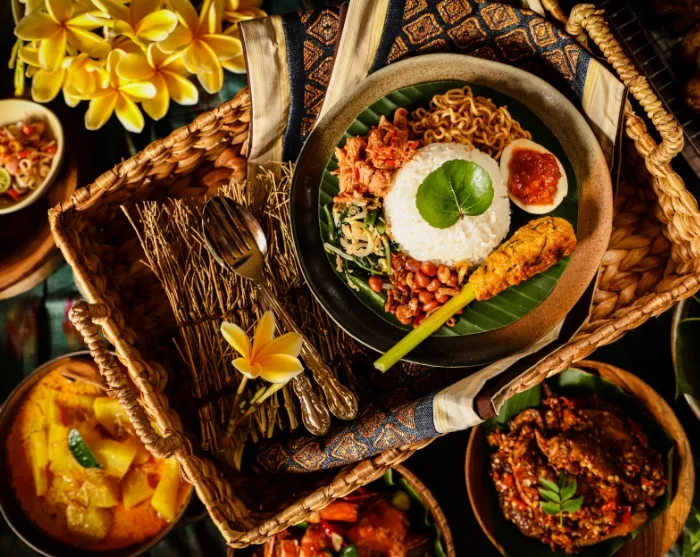 Efter promenaden återvänder du till Kaura, där du fortsätter dagen i resortens öppna kök tillsammans med en grupp varma och välkomnande kvinnor från den lokala byn. Här får du lära dig att laga klassiska balinesiska rätter med färska lokala råvaror, medan dina värdar generöst delar med sig av sina recept och berättar om matens roll i byns gemenskap. Du får en inblick i de tekniker och smaker som gått i arv genom generationer, och du känner den glädje och stolthet som följer med att laga mat tillsammans.