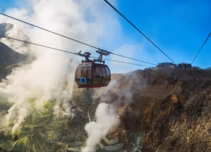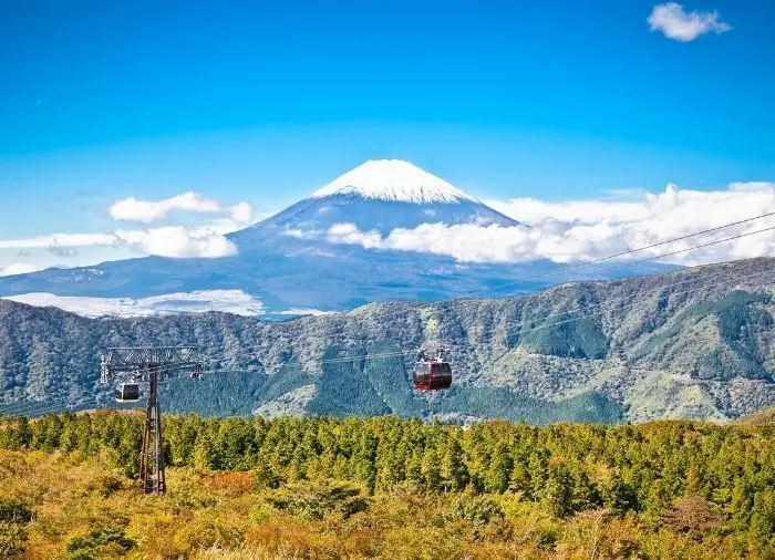 Därefter tar du linbanan från Owakudani Station ner till Togendai Station. Detta är den längsta linbanan i Japan och gondolen har fönster på alla fyra sidor, så det finns stor möjlighet att njuta av den vackra utsikten.