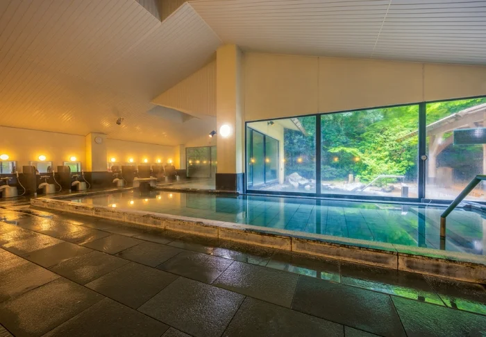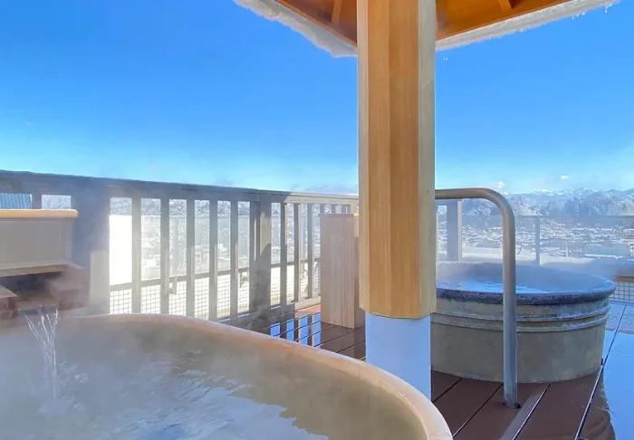 Hotellet har flera badområden, bland annat det spektakulära utomhusonsen på hotellets översta våning där du kan njuta av utsikten mot de japanska alperna. Nedanför finns dessutom en sentō – ett traditionellt japanskt badhus med tatamigolv, ukiyoe-konst på väggarna och en rofylld atmosfär. Båda avdelningarna erbjuder bastu och goda möjligheter till vila efter en lång dag.