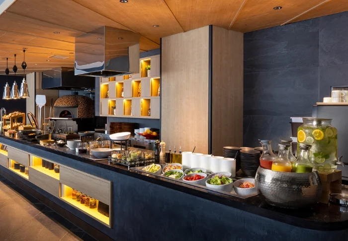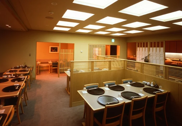 Hotellets inbjudande restaurang med högt i tak och stora fönster ramar vackert in årstidernas skiftningar, från vårens färgpalett till höstens röda löv. Här väntar en välsmakande frukostbuffé med mer än 25 olika rätter, främst inspirerade av det japanska köket. Om du väljer att äta här på kvällen serveras japanskinspirerade måltider med fri dryck (inkl. alkohol) i 90 minuter.