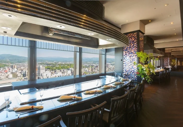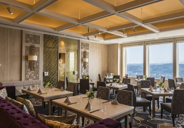 Hotellets främsta höjdpunkt är utan tvekan restaurangen på översta våningen, där en spektakulär panoramautsikt över stad och berg breder ut sig i ett färgspel som skiftar med årstiderna. Här väntar en inbjudande frukostbuffé som kombinerar säsongsfärska råvaror från det närliggande området med härliga smaker från både det japanska och det internationella köket.
