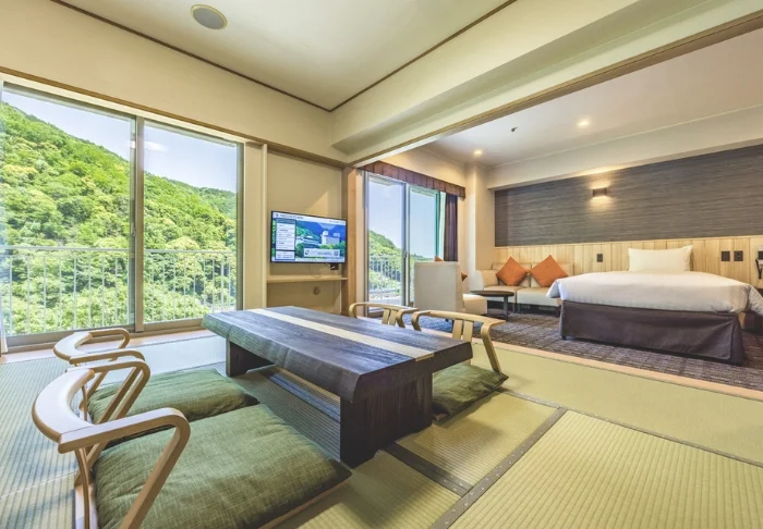 Du bor som standard i ett ljust och enkelt rum inrett i japansk stil med moderna bekvämligheter. Här har du tillgång till wifi, TV, minibar, värdeskåp samt te- och kaffefaciliteter. Badrummet är utrustat med gratis toalettartiklar, hårtork och badkar med dusch, samt jinbei – den perfekta dräkten att ta på sig på vägen till hotellets varma bad.