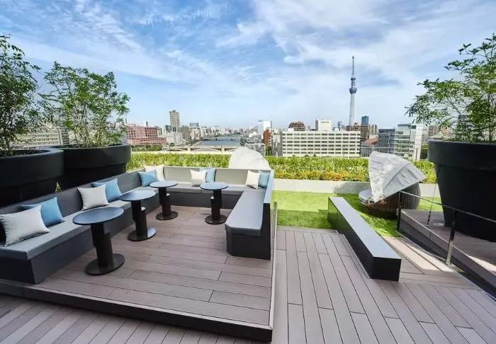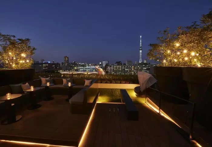 Efter en dag med upplevelser kan du njuta av en solnedgångsdrink på hotellets takterrass med vacker panoramautsikt över Tokyo Sky Tree och Sumida-floden.