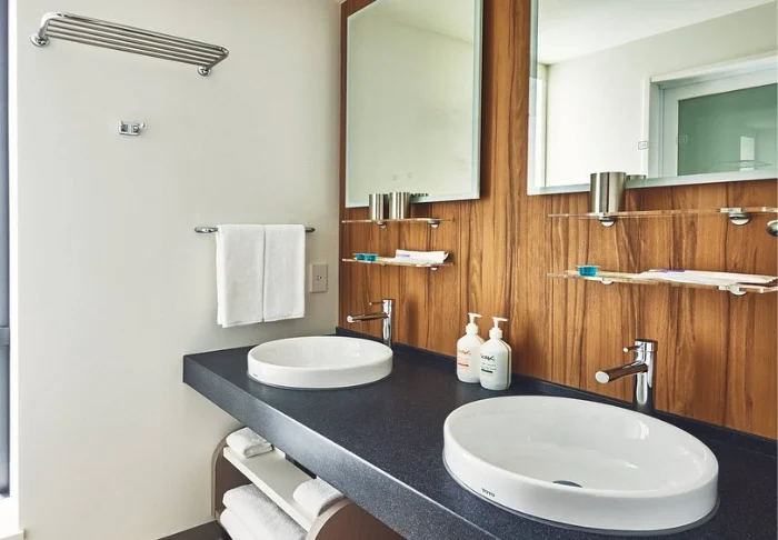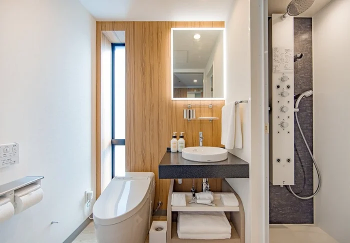 Du bor på ett standard-rum med ljus och behaglig inredning samt moderna bekvämligheter. Här finns wifi, aircondition, TV, värdeskåp, minikylskåp, vattenkokare för te och kaffe samt tillgång till en vattenautomat med filtrerat vatten i korridoren. Sängarna är bekväma, och du kan välja mellan både mjuka och fasta kuddar för en god natts sömn. Badrummet är utrustat med washlet-toalett, hårtork, kostnadsfria toalettartiklar och en separat dusch med regndusch.