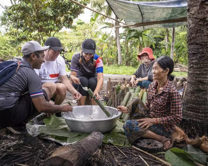 Ni stannar till vid små gårdar, där du kommer att få se bönder som arbetar på fälten och lära dig om de processer som är nyckeln till deras liv och försörjning. Du kommer också att få uppleva traditionella aktiviteter som sockerproduktion och risodling, medan det också blir tid till att njuta av kambodjanska snacks som är gjorda av lokala ingredienser och tillagade på traditionellt sätt.