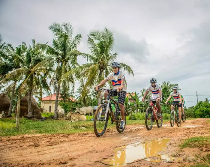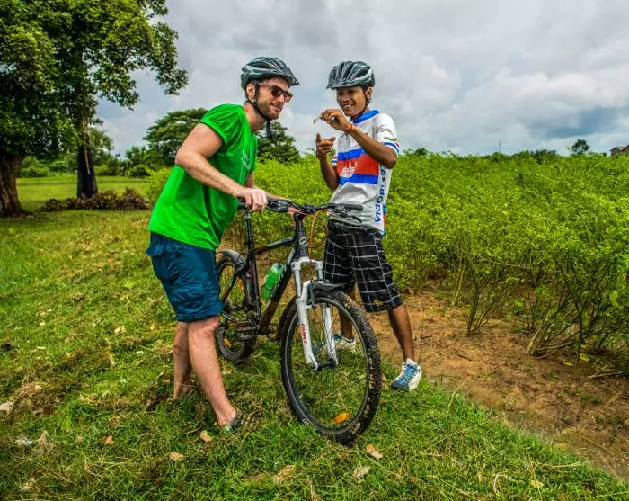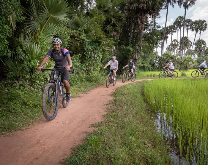 Cykelturen går via en idyllisk rutt längs Siem Reap-floden, där du kan njuta av den friska morgonluften och den fridfulla atmosfären. Här lämnar ni de vanliga turistvägarna och ger er ut på charmiga grusspår som slingrar sig genom den frodiga landsbygden och pittoreska byar.