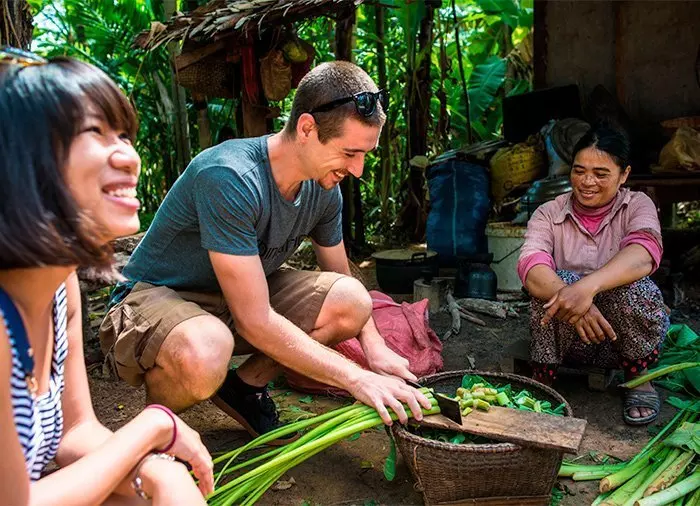 Du blir hämtad på ditt hotell och startar med att uppleva den livliga morgonhandeln på den lokala marknaden med alla färska råvaror. Sedan fortsätter du ut till det ekologiska lantbruket, där du själv ska skörda och samla några av grönsakerna som ska användas till dagens matlagning. En duktig lokal kock leder dig genom tillberedningen av specialiteterna, medan du får höra om hur den kambodjanska kulturen påverkar matkulturen.