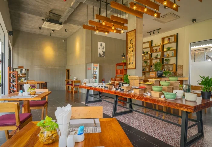 På hotellets restaurang serveras både lokala rätter och internationella favoriter i en avslappnad miljö.