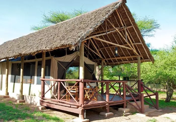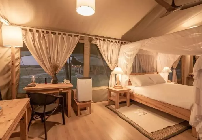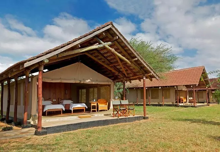 Tälten är av rimlig storlek och har alla en veranda samt delvis murat badrum. Alla tält är utrustade med wifi och möjlighet att brygga te och kaffe.