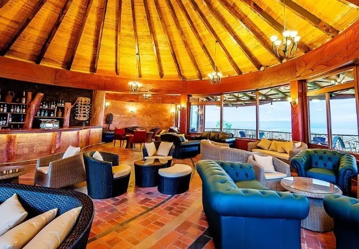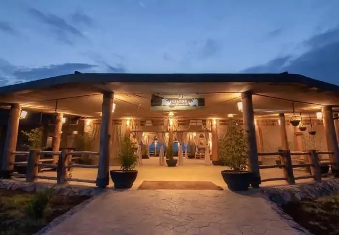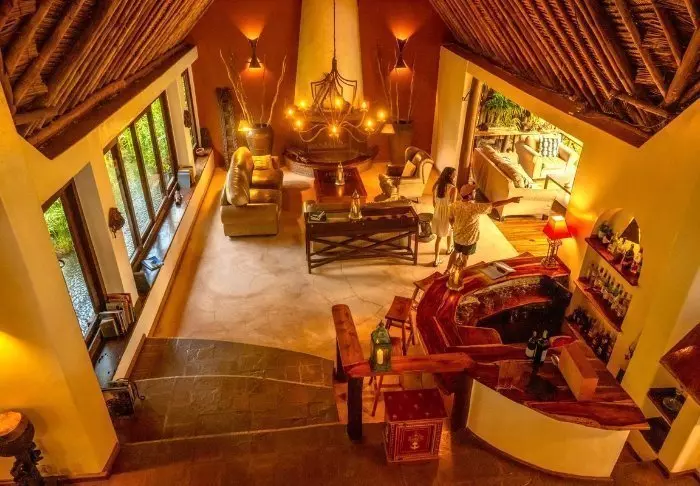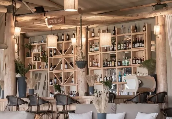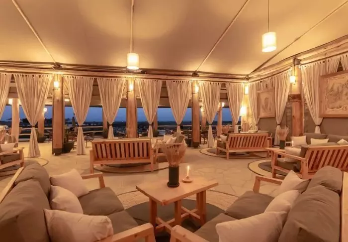 Bar och restaurang bjuder in till mys med mjuka soffor och små myshörn, och precis som tälten är de fint inredda med naturmaterial såsom trä och sten. Färgerna är dämpade så att fokus hålls på naturen utanför.