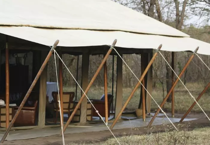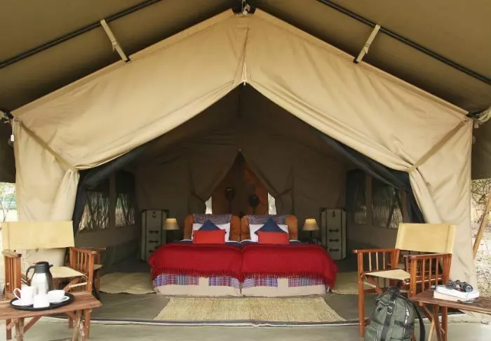 Totalt 20 kanvastält som kan inredas för en, två eller tre personer, eller som familjetält om du reser med familjen. Samtliga har fast golv, eget badrum med varmt och kallt vatten i duschen, myggnät kring sängarna och stora fönster (bestående av myggnät som du kan stänga för genom att rulla ner en kanvasduk), så att du kan njuta av den vackra utsikten över slätterna omkring dig. Varje tält har en liten ”veranda” utanför med stolar och bord varifrån du kan njuta av utsikten – och kanske en bra bok.