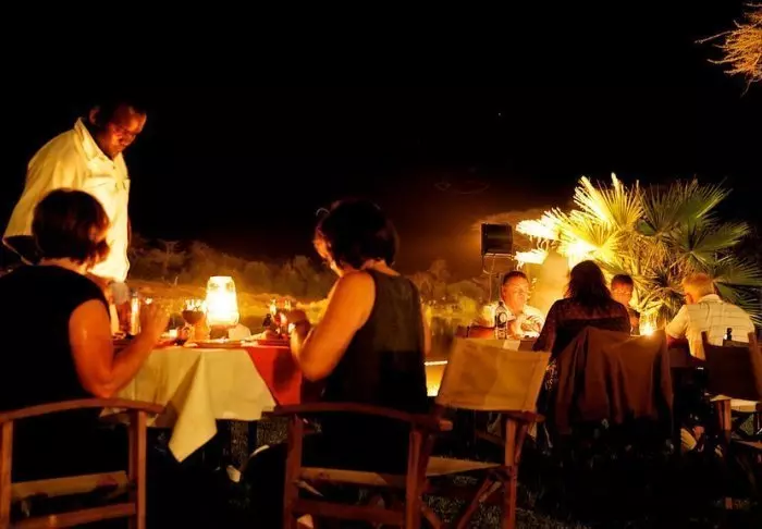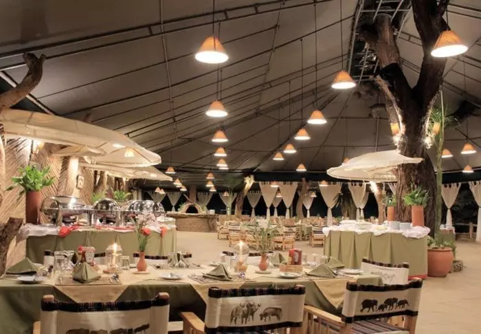 Måltiderna serveras i huvudbyggnaden, där du även hittar receptionen och den mysiga baren. På utvalda kvällar bjuds det ibland till och med på livemusik i baren. Framför restaurangen ligger en stor gräsmatta med bänkar och mysiga hörnor, varifrån du har utsikt över vattenhålet, och mitt emellan restaurangen och tälten hittar du poolen, omgiven av solstolar.