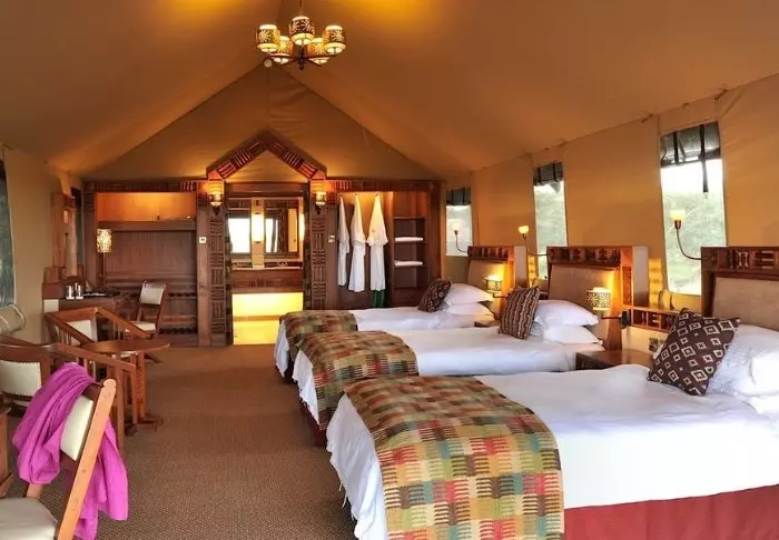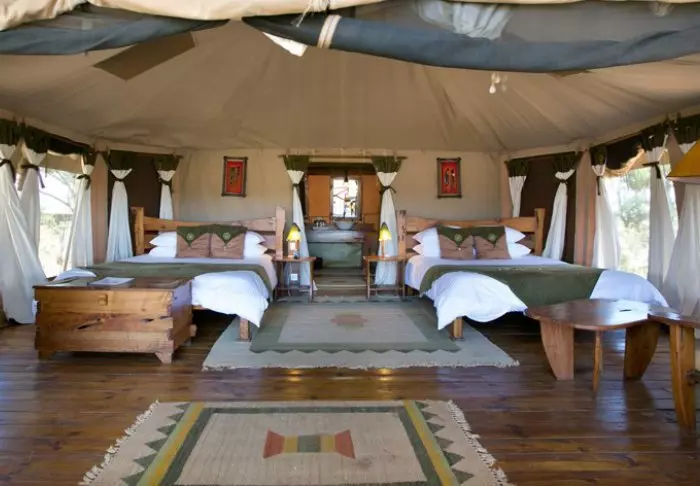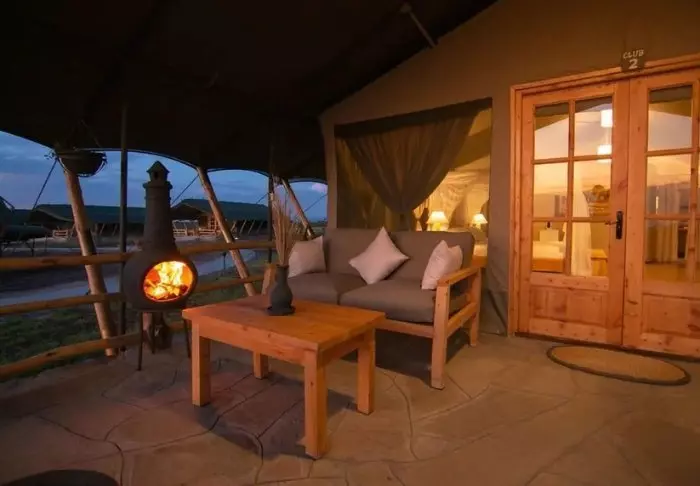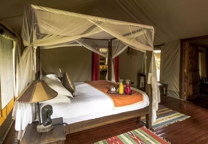 Tälten är stora och välinredda. Sängarna har duntäcken och härliga bomullslakan, och massajkulturen avspeglar sig i inredningen med färgglada överkast och handgjorda möbler. Samtliga tältväggar består av kanvas – även badrummen. Men här finns en riktig toalett, rinnande vatten och dusch, så även om du bor i tält och kan höra och känna doften av bushen utanför, kompromissar du inte med bekvämligheten. Framför varje tält finns en privat liten ”veranda” med safaristolar och bord, och vi gissar att du kommer att tillbringa en del timmar här och betrakta naturen omkring dig.