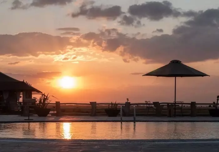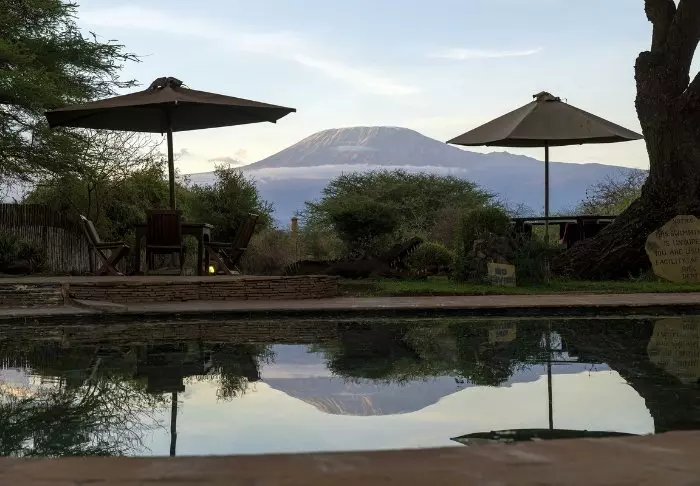 På en avskild väg nära ingången till Amboseli Nationalpark ligger Amboseli Sentrim Lodge, där du har en helt fantastisk utsikt över Afrikas högsta berg Kilimanjaro.