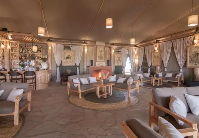I lägren finns ett gemensamt tält med fina lädermöbler där du kan koppla av efter middagen, som antingen serveras under bar himmel eller i restaurangtältet.