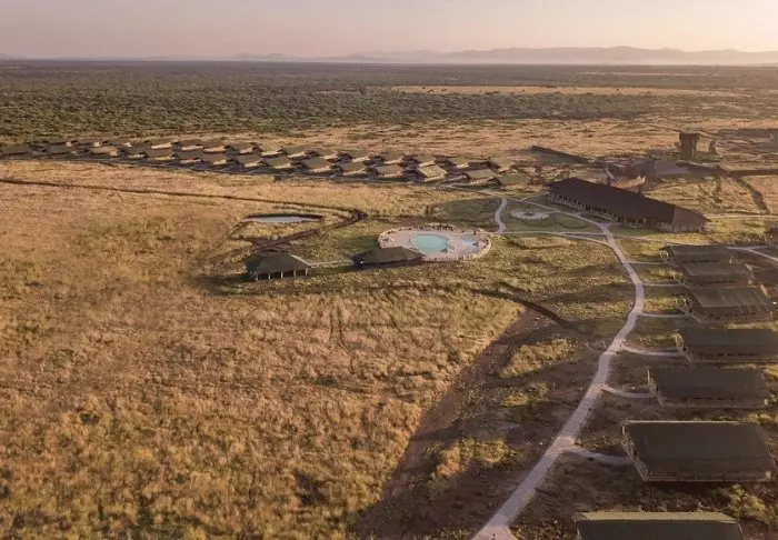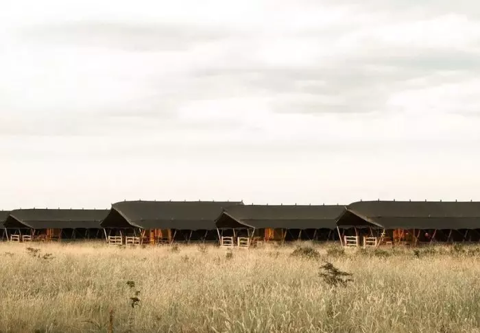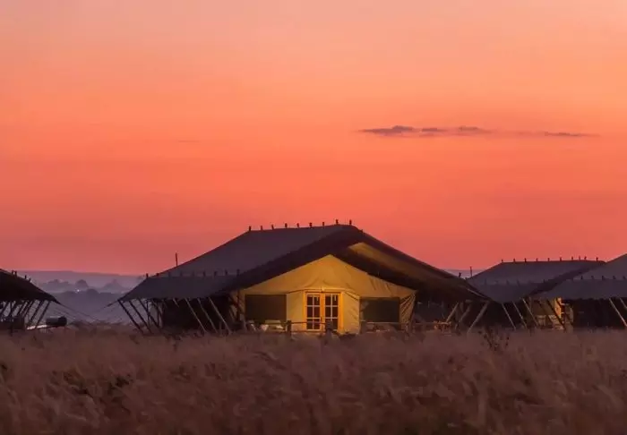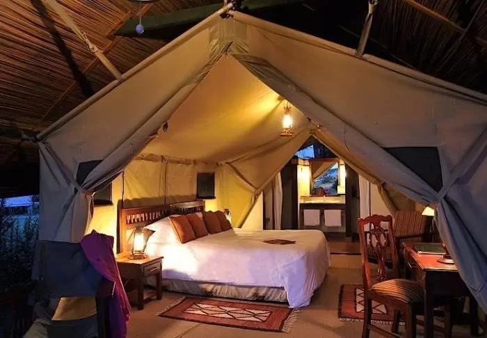 Här övernattar du i ett av de 60 stora, rymliga tälten som står utspridda över slätterna. I varje tält finns en bekväm säng, en liten sittgrupp, ett kylskåp, te- och kaffekokare samt en egen liten veranda och privat badrum med dusch, handfat och toalett.