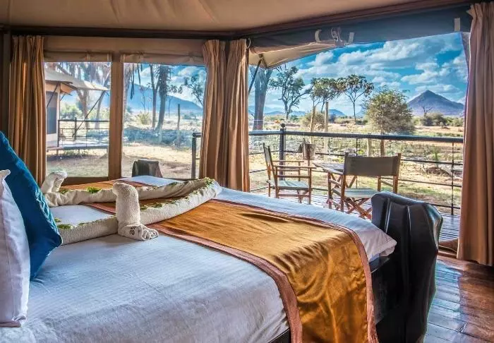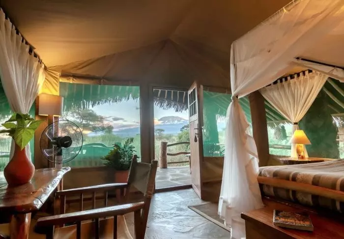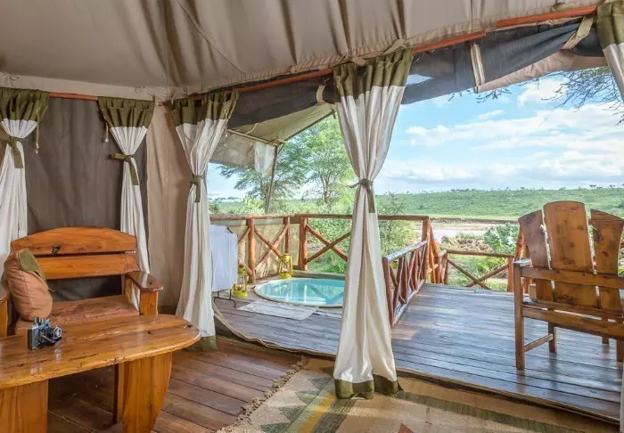 Här finns 29 rymliga och väl inredda tält. Det finns inte så många krusiduller, men man har ändå tänkt på allt. Alla tält har en egen veranda – några av dem har till och med en egen avsvalkningspool – och en vacker utsikt över Kilimanjaro.
