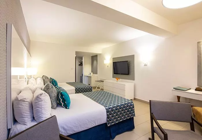 Resorten består av 170 rum i olika kategorier som alla har sin egen terrass eller balkong. Dessutom har alla rum aircondition, wifi, te- och kaffefaciliteter, minibar, värdeskåp och platt-tv.