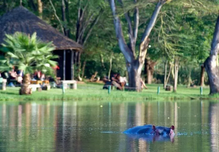 De 25 tälten ligger alla i förlängning av varandra, med restaurangen som naturlig mittpunkt. Det innebär att alla platser har en härlig utsikt över dammen med flodhästar – och berget i grannlandet Tanzania.