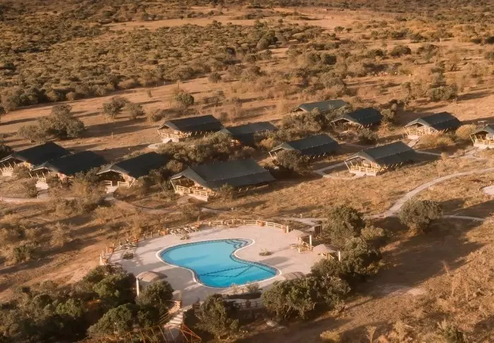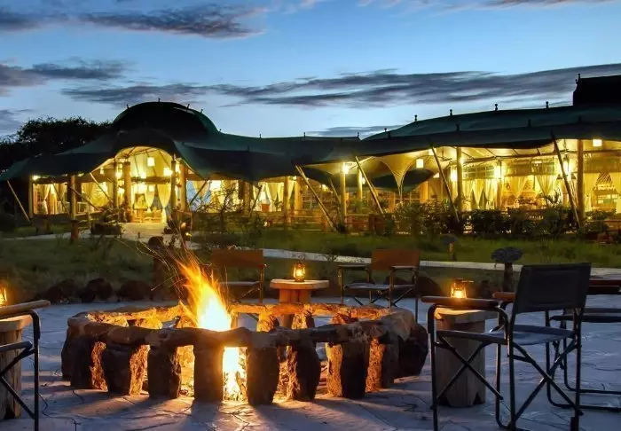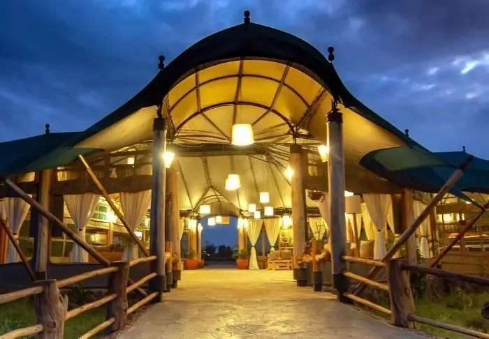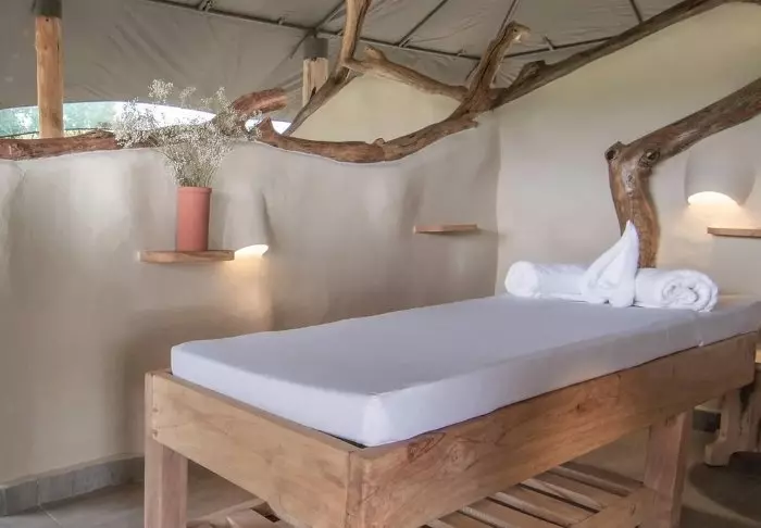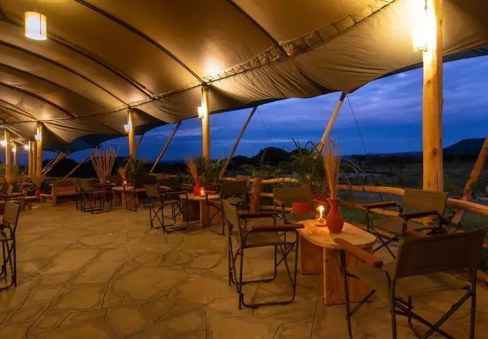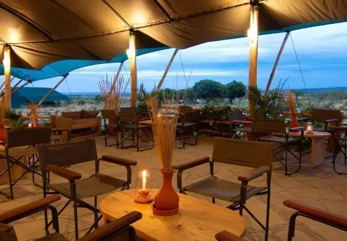 Bar och restaurang bjuder in till mys med mjuka soffor och små myshörn, och precis som tälten är de fint inredda med naturmaterial såsom trä och sten. Färgerna är dämpade så att fokus hålls på naturen utanför.