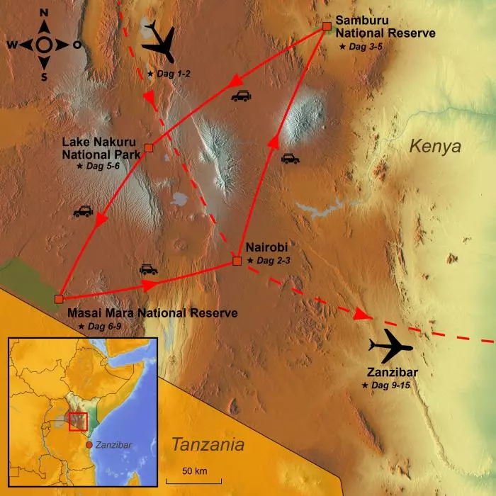 Upplev det bästa av Kenya. Du kommer nära inpå det fantastiska djurlivet och den underbara naturen i några av landets bästa nationalparker och smälter intrycken på vita sandstränder på Zanzibar.