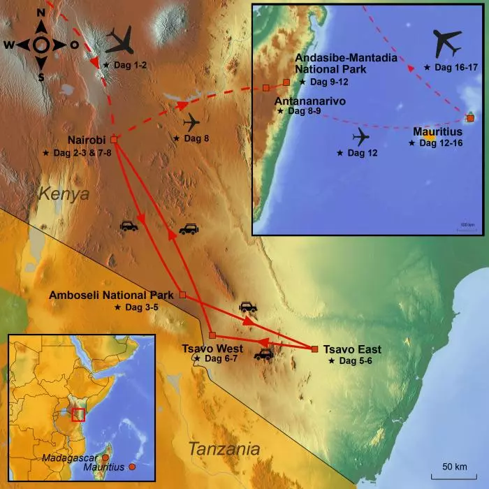 I Kenya får du uppleva noshörningar, elefanter och lejon. På Madagaskar vandrar du genom regnskogen och letar efter lemurer och kameleonter innan du avslutar din resa med en solsemester på exotiska Mauritius.