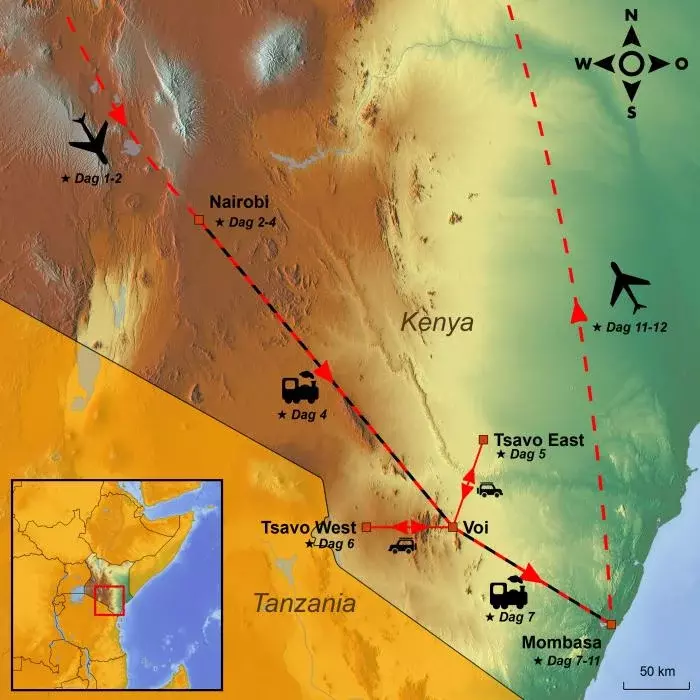 På morgonen hämtas du på ditt hotell och körs till järnvägsstationen i Nairobi. Härifrån tar du tåget till den lilla staden Voi, som ligger precis vid ingången till Kenyas största nationalpark, Tsavo East.