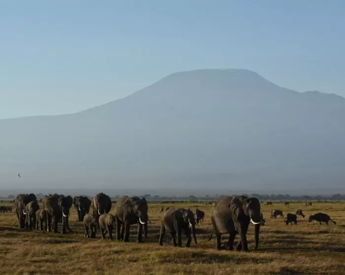 Nästan vart du än går har du utsikt över Kilimanjaro, som ligger i Tanzania, men som förmodligen fotograferas oftare från Kenya-sidan. Det är här i Amboseli som du kan ha turen att få det perfekta fotot på elefanter som går över det pannkaksliknande landskapet när solen går ner innan de ger sig in i skogarna vid foten av Kilimanjaro, där de tillbringar natten. Elefanthjordarna är stora, och många av elefanterna har gigantiska betar.