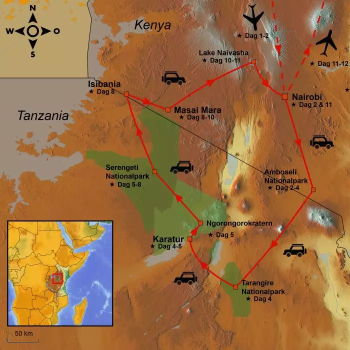 Resan börjar i Amboseli nationalpark i Kenya. Du känner säkert igen parken från bilder som ofta visar elefanter med Kilimanjaro i bakgrunden. Därefter får du lära känna Tanzania. Du passerar gräsen och besöker Tarangire nationalpark i Tanzania. Parken är särskilt känd för sina elefanter och de enorma baobabträden. I Ngorongorokratern väntar en Jurassic Park-liknande upplevelse innan landskapet förändras dramatiskt när du beger dig ut på de mäktiga Serengetislätterna. Här slutar de flesta safariturerna, men inte din – du passerar gränsen igen och i Kenya väntar nu Masai Mara. Sista stoppet på resan är Naivashasjön, innan du körs till flygplatsen i Nairobi. Här finns det möjlighet att förlänga resan med solsemester till Mombasa, Zanzibar eller Mauritius.