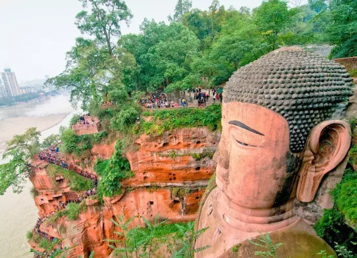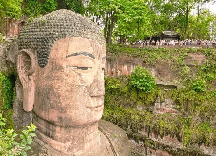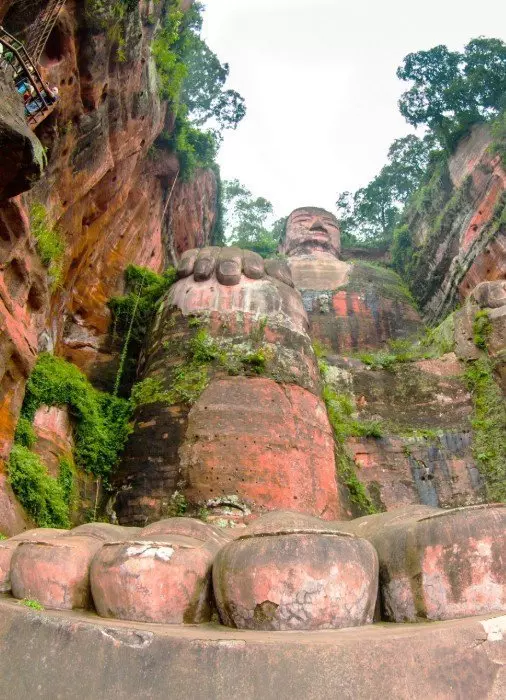 När du kommer till utsiktsplattformen står du praktiskt taget ansikte mot ansikte med buddhan, som är 71 meter hög och 28 meter bred. Här kan du beundra de 1 021 fint uthuggna hårstråna. En smal stentrappa med 217 steg går längs buddhans sida och ända ner till dess fötter. Längs vägen kan du beundra den imponerande statyn från olika vinklar. Storleken överraskar de flesta – bland annat har huvudet en storlek på 14,7 meter, fingrarna är 8,3 meter långa med naglar som är större än en genomsnittlig människa, och fötterna har en längd på 11 meter. Statyn är verkligen imponerande och överväldigande!