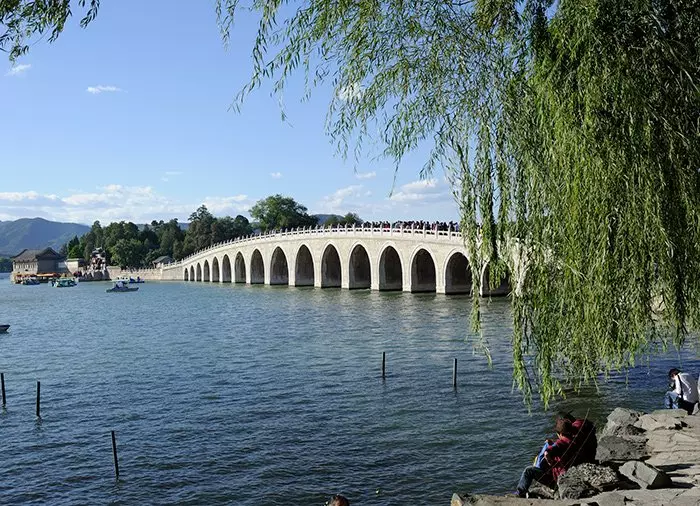 Från korridoren har du utsikt över Kunming-sjön och den lilla ön Nanhu, där Draktemplet och Wangyan-paviljongen ligger. Ön förbinds med fastlandet med den vackra 17 bågars bro. Att bron har 17 valv är naturligtvis ingen slump. Det nionde valvet i mitten symboliserar den kejserliga makten, och de åtta valven på bägge sidorna av den symboliserar lycka och välstånd.