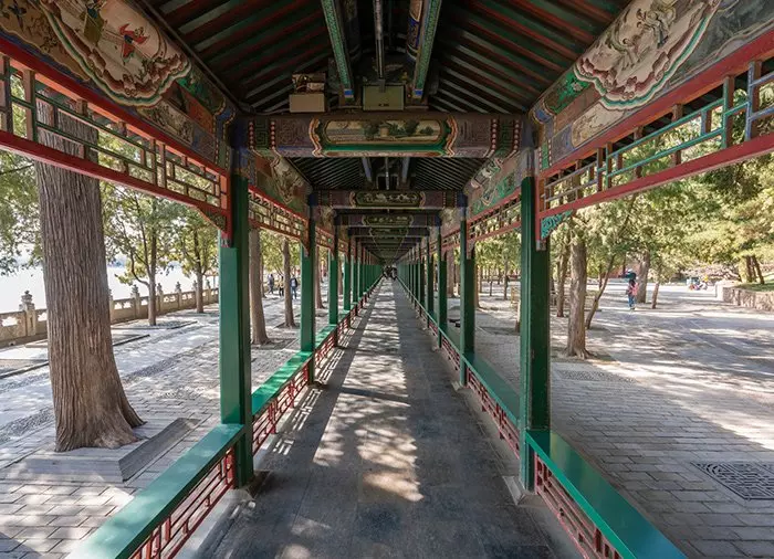 Rundvandringen börjar vid den östra ingången, där du kan se palatsen. Därefter väntar en promenad i ”Den långa korridoren”, som kejsare Qianlong byggde till sin mor så att hon skulle kunna njuta av utsikten över Kunming-sjön under vintern eller när det regnade. Korridoren är 728 meter lång och är utsmyckad med 14 000 färgrika målningar. Från den ena änden till den andra går du genom fyra åttkantiga paviljonger, som representerar de fyra årstiderna.