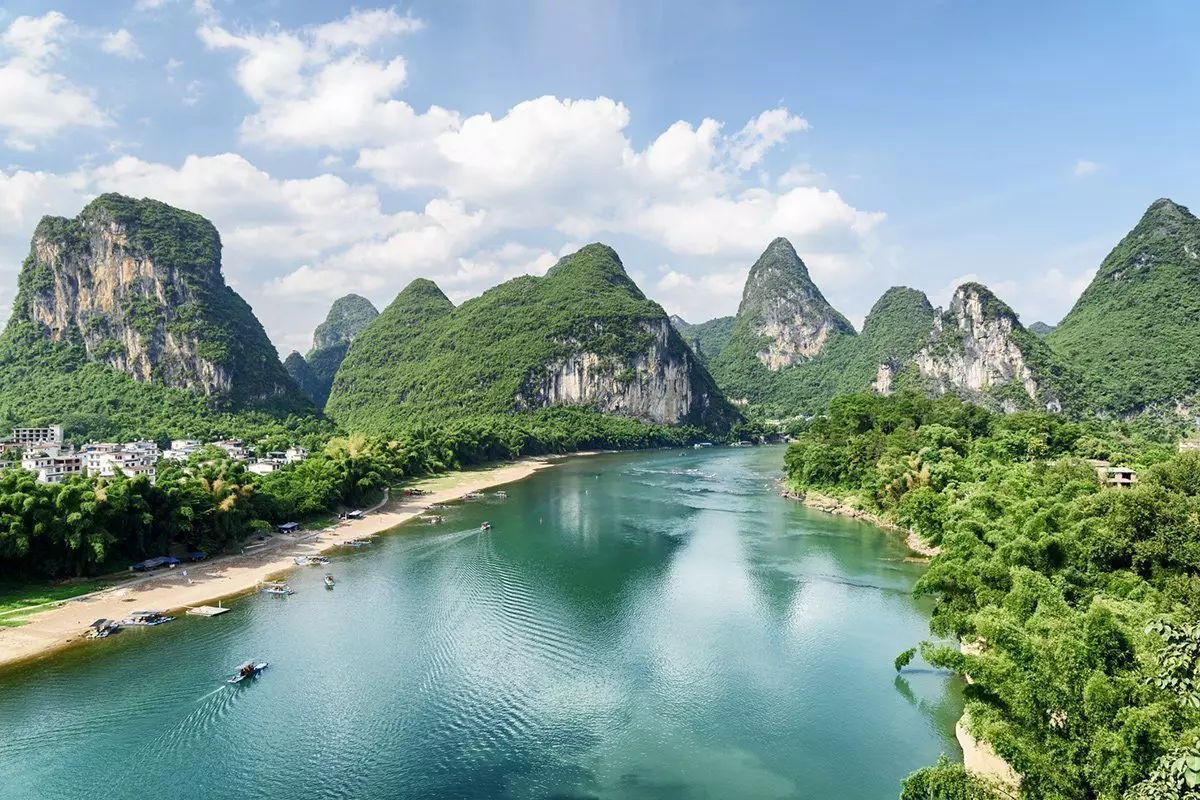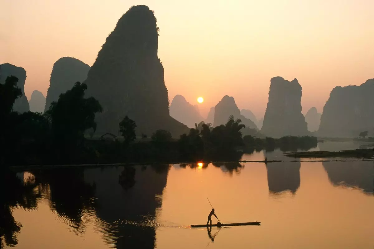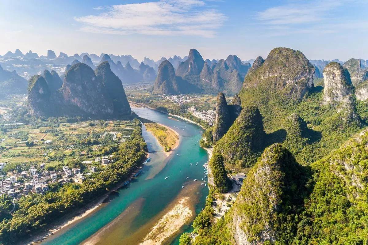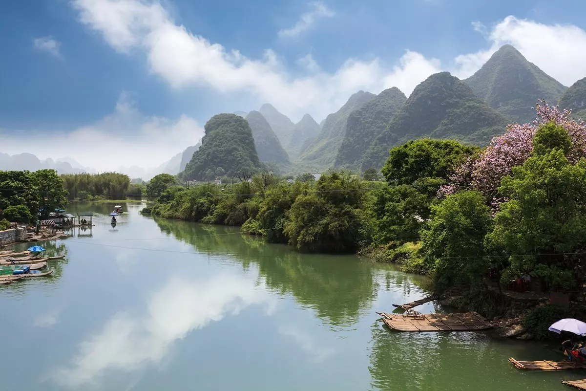 Ju längre sydväst du kommer, desto friskare blir luften. Det märks särskilt tydligt i Yangshuo, där du förtrollas av de poetiska och intagande landskapen. Här står höga, asymmetriska kalkstensberg, som avspeglas i de lugna floderna Li och Yalong. Landskapet är så vackert att det har förevigats på Kinas 20 yuan-sedel.