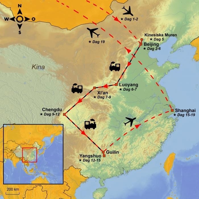 Du startar i den kejserliga huvudstaden Beijing, där du besöker den enorma samlingspunkten Himmelska fridens torg. Bakom de tjocka, röda murarna norrut döljer sig det mäktiga kejsarpalatset i Den förbjudna staden. Norr om palatset ligger det konstgjorda Kolberget, där du i klart väder har en härlig utsikt över palatset och den livliga huvudstaden.
