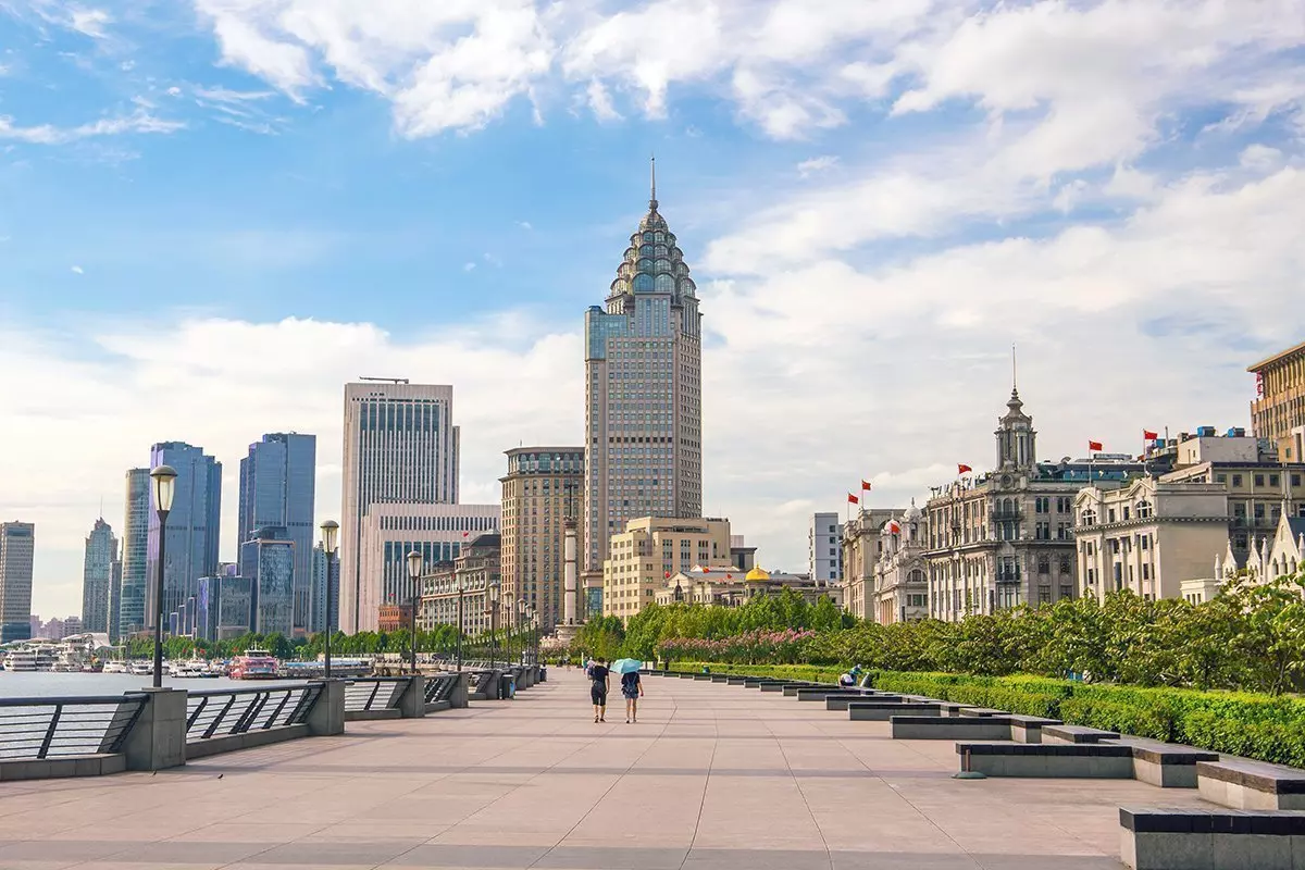 Du får promenera längs The Bunds 1,5 km långa hamnpromenad som löper längs Huangpu-floden. Här får du en känsla av att befinna dig i två världar. På den ena sidan av floden ligger de vackra grå engelska stenbyggnaderna med praktfulla pelare, och på den andra sidan ser du Shanghais berömda skyline med moderna skyskrapor, som lyses upp när mörkret faller. På 1930-talet var The Bund Shanghais motsvarighet till Wall Street. Här fanns både det tidigare engelska konsulatet, Bank of China, huvudkvarteret för North China Daily (dåtidens engelskspråkiga tidning), det gamla tullhuset som byggdes som en kopia av Big Ben samt Hong Kong & Shanghai Bank, som 1923 var världens nästa största bank. I dag huserar byggnaderna exklusiva modebutiker, hotell, nattklubbar och restauranger.