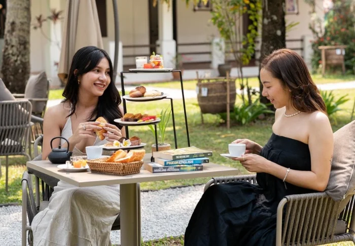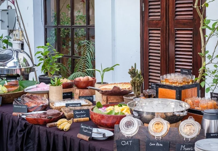 I hotellets restaurang serveras både lokala och internationella rätter, och du kan börja dagen med en frukost i den öppna paviljongen med utsikt över trädgården.