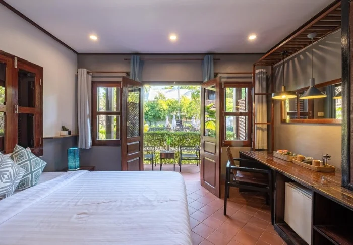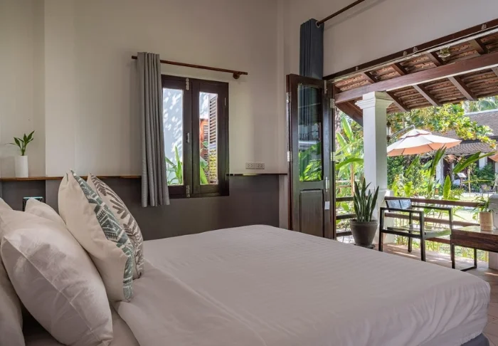 Du bor som standard i ett Superior-rum med utsikt över hotellets lotusdamm. Här kan du slå dig ner på din terrass och njuta av vyn över det stilla vattnet och de gröna omgivningarna. Rummen är inredda i en enkel och elegant stil med trägolv, stora fönster och ljusa färger för en rogivande känsla. Du har aircondition, minibar, TV och wifi, och badrummet är utrustat med dusch samt nödvändiga bekvämligheter.