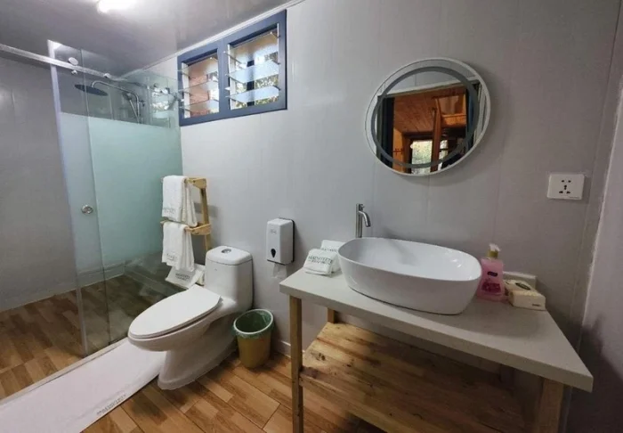 De 23 rummen är stora och inredda med respekt för den omgivande naturen. Rummen har trägolv och går i dämpade färger, och från duschen har du utsikt över skogen runt dig. I badrummen tillhandahålls miljövänlig tvål och schampo, och allt överskottsvatten samlas och filtreras innan det återanvänds för att vattna den blommande trädgården utanför.