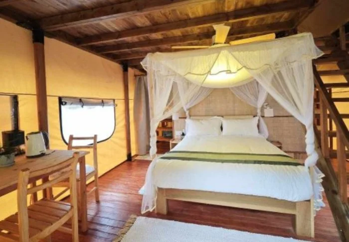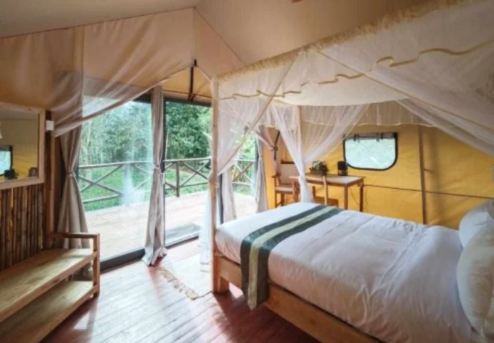 Rummen består delvis av bungalower, delvis av lyxtält, alla enkelt men komfortabelt inredda med trädetaljer, myggnät och en liten terrass där du kan sitta med en kopp kaffe och lyssna på djungelns ljud. Det finns varmvatten i duschen, elektricitet större delen av dygnet och tillgång till wifi i de gemensamma utrymmena.