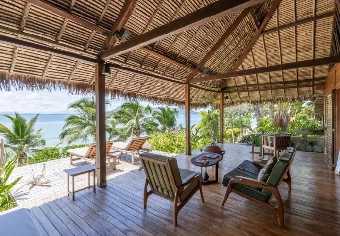 Bungalowerna är byggda av sten med halmtak och bjälkar av rosenträ. Vackra, varma trägolv välkomnar dig, och väggarna är smakfullt dekorerade med lokal konst och hantverk. Tillräckligt mycket – men inte så mycket att det stör utsikten från de stora fönstren. Tack vare lodgens strandläge har alla bungalows utsikt över stranden. Du kan också njuta av detta från din privata terrass, där du hittar ett par solstolar som väntar på att användas.