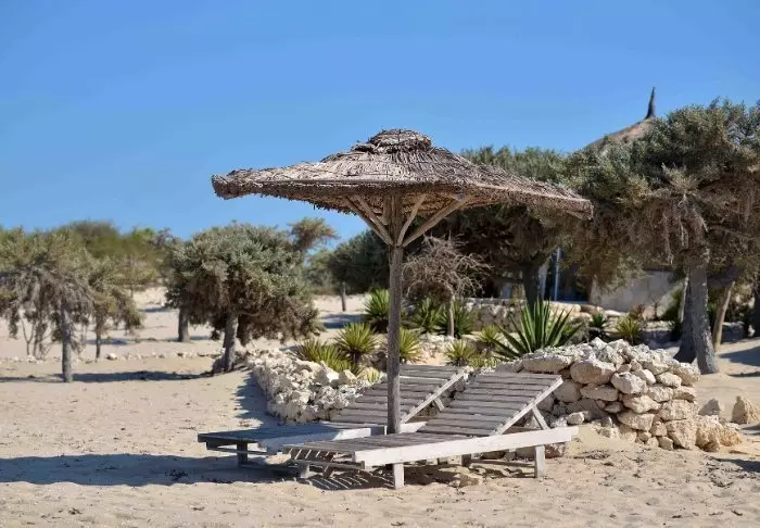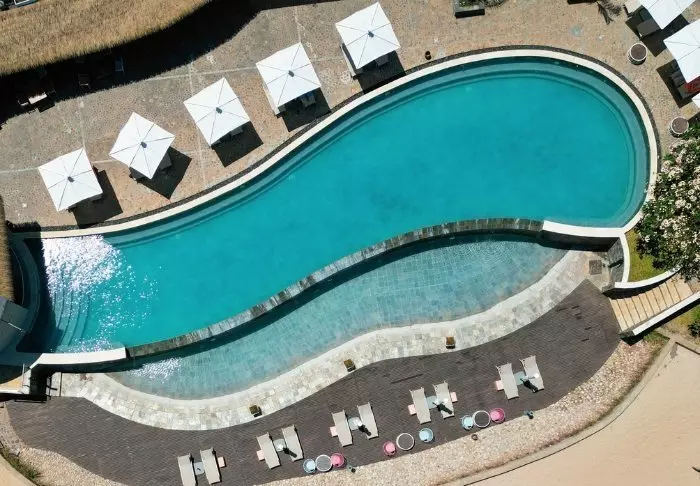 Poolen ligger med utsikt över stranden och har gott om plats för solstolar – perfekt för en lugn dag med en bok och ett svalkande dopp. Stranden nedanför är bred och stillsam – idealisk för en promenad i den varma sanden.