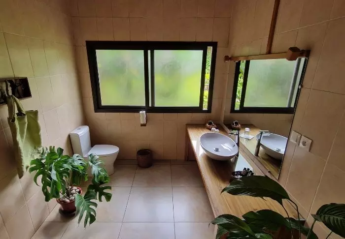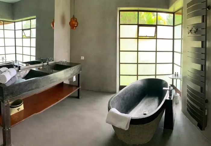 Rummen ligger på en sluttning omgiven av regnskog, och inredningen är ljus och varm – en blandning av nordisk enkelhet och en touch av Bali.