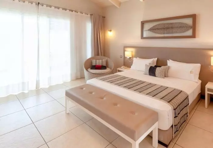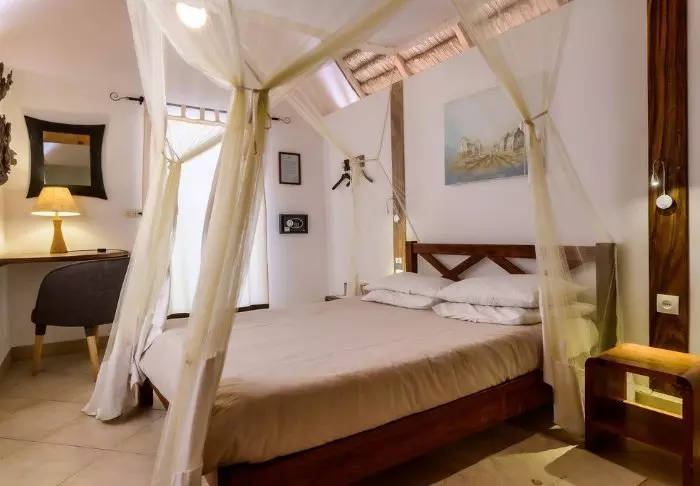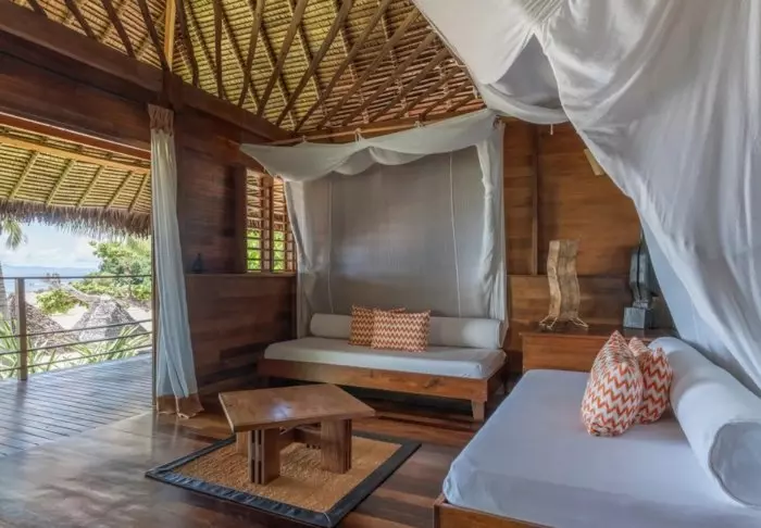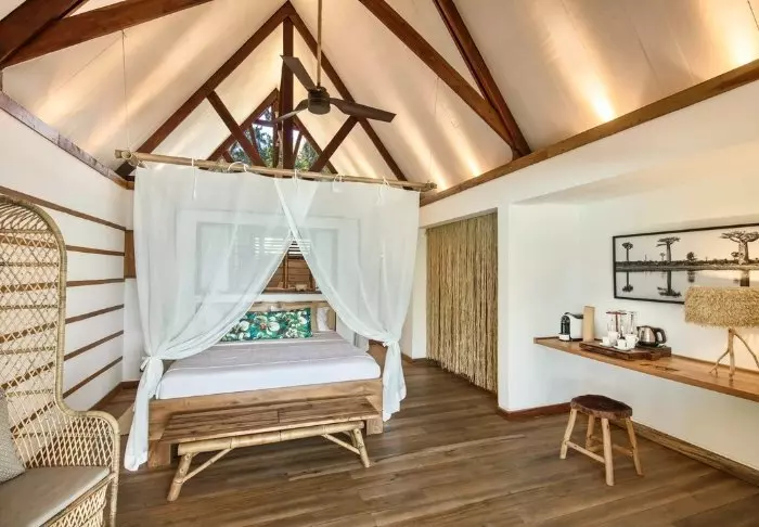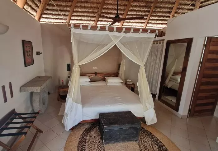 Inredningen är enkel och naturnära med trägolv, stora sängar med myggnät och vackra detaljer i sisal och textil. Här finns aircondition, wifi, värdeskåp och minibar, och badrummen är rymliga och ljusa med både dusch och badrumsartiklar.