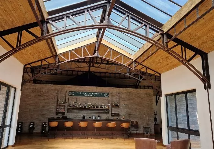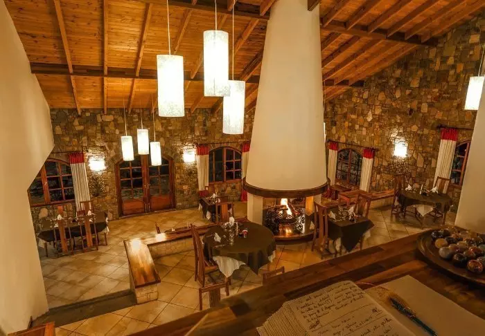 Lodgen kännetecknas av sin supermoderna och samtidigt både råa och eleganta industriella design med högt i tak, en stor öppen spis mitt i restaurangen och tak med stålstrukturer. Inspiration har tydligt hämtats från grafitgruvan och den tillhörande industrin som du för vidare på vägen till lodgen.
