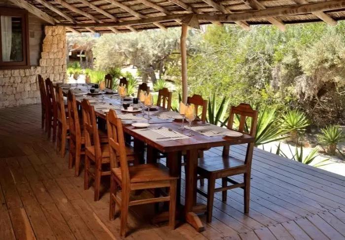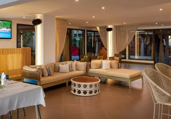 Restaurangen serverar läckra rätter med bland annat dagsfärsk fisk och lokala råvaror, och frukosten kan avnjutas i skuggan på terrassen. Baren ligger intill poolen och är den självklara platsen att avrunda dagen på, medan solen sakta försvinner ner i havet.