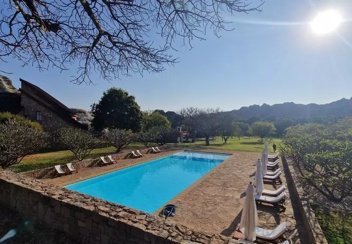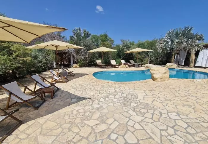 Koppla av vid den mysiga poolen, njut av en massage i spa-avdelningen eller gå på en kort vandring i området – kanske med ett sista dopp i platsens egen oasdamm.