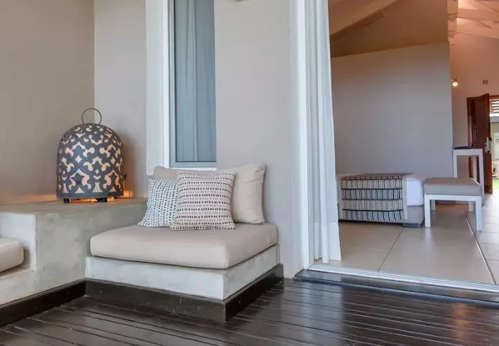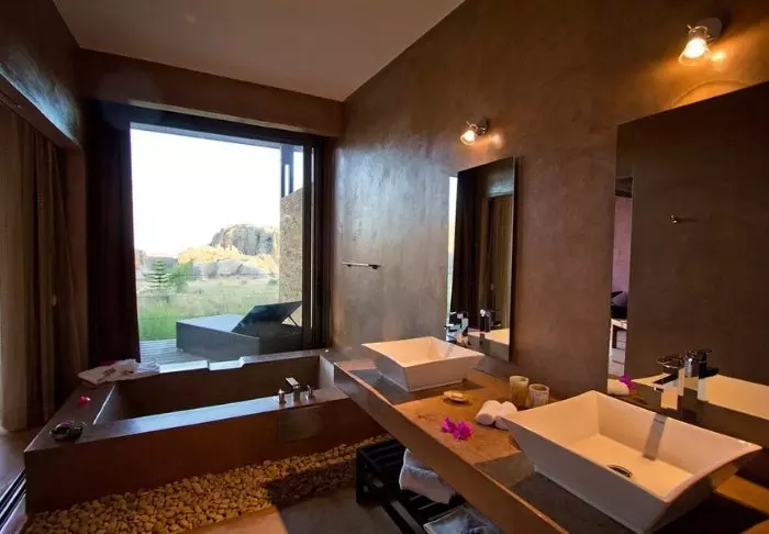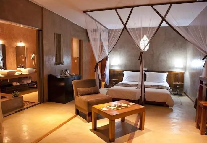 Inne i lodgen kan du tydligt känna influenserna av den afrikanska kontinenten. Bruna färger, trä och sten dominerar, men på ett lyxigt och smakfullt sätt. Allt är vackert dekorerat, och det känns nästan som om du besöker en privat konstsamlare.