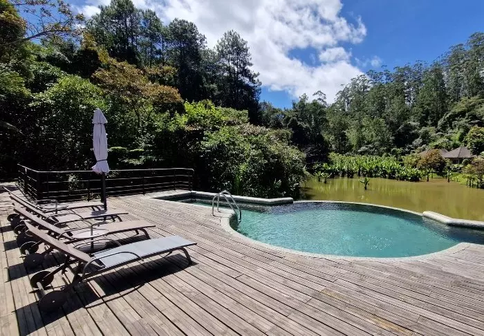 Lodgen är byggd på en kulle, så utsikten från poolområdet är enastående. Framför dig ligger regnskogen – men det är inte en regnskog vilken som helst. Det är ursprunglig regnskog från den tid då alla jordens kontinentaltplattor satt ihop och bildade en superkontinent.