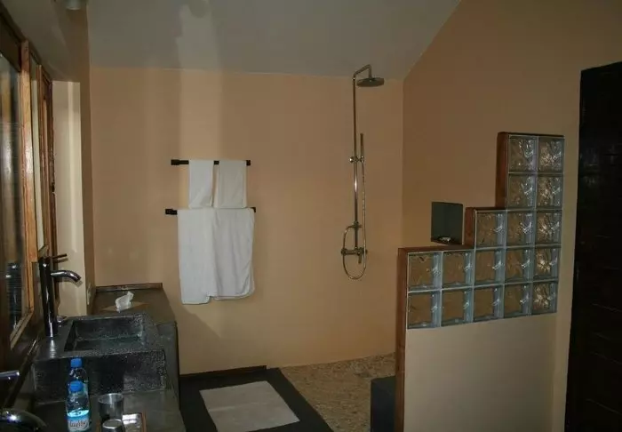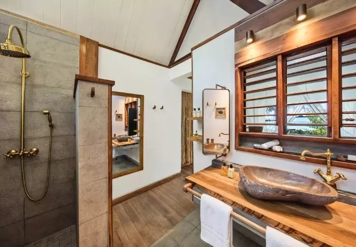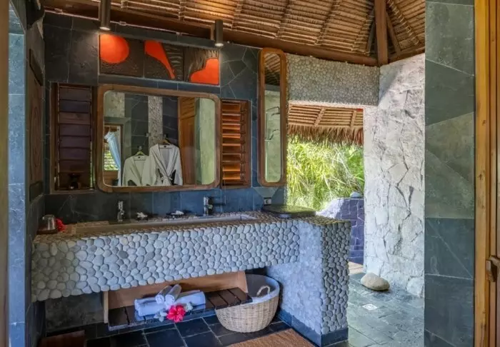 Alla bungalows har givetvis egna badrum, där duschen är utomhus, så du aldrig är långt ifrån naturen.